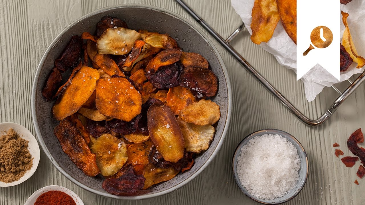 Gemüsechips selber machen? Kein Problem. Kev zeigt euch, wie ihr den gesunden Snack aus Rote Beete, Süßkartoffel, Pastinake, Karotte oder Topinambur ganz schnell zaubern könnt. Also: Ran an‘s Gemüse und danach ab aufs Sofa!