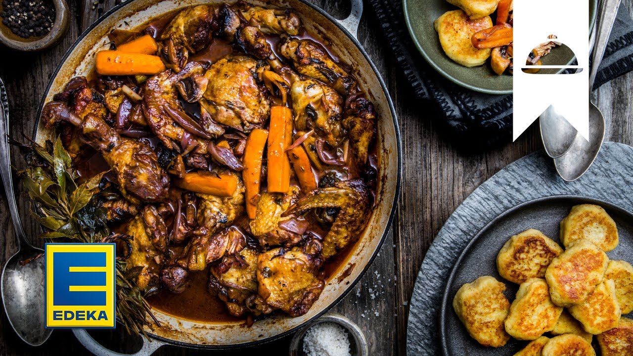 Hähnchen in Wein wird regional unterschiedlich gekocht: Raffinierte Rebsorten, Gewürze und Zutaten schicken Sie immer wieder auf neue kulinarische Entdeckungsreisen. Bereichern auch Sie Ihr Repertoire mit leckeren Coq-au-Vin-Rezepten!