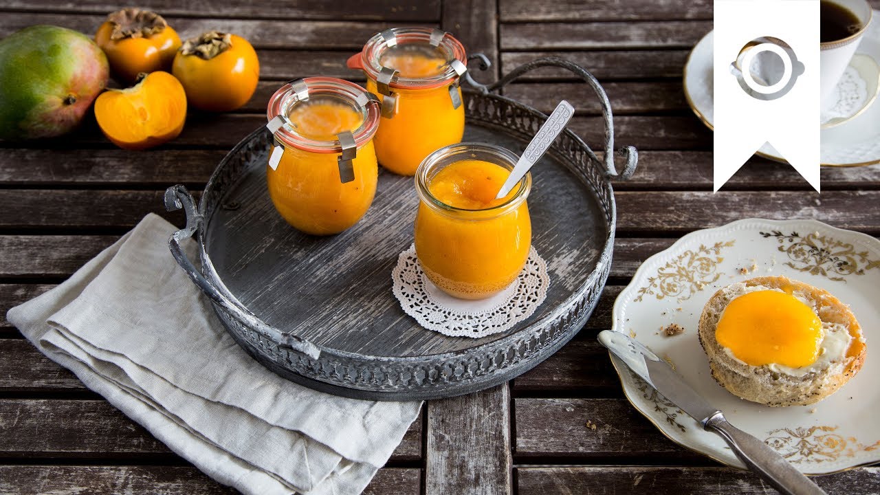 Mit Mango und Zitrusfrüchten sorgt die Kakikonfitüre für ein aromatisches Highlight auf dem Frühstückstisch. Ein Plus: Der Brotaufstrich schmeckt nicht nur lecker, sondern ist auch noch voller wichtiger Vitamine – für einen gesunden Start in den Tag.