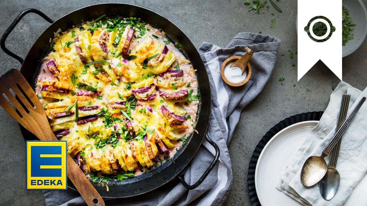 Fast ein wenig unscheinbar, leicht zurückhaltend liegt es als Beilage häufig neben Fleisch, Fisch oder Gemüse. Mit Gabel Nummer eins nimmt Kartoffelgratin dann allerdings schnell eine Hauptrolle ein. Es ist die Königsdisziplin unter den Gratin-Gerichten. Die feinen Kartoffelscheiben. Das leichte Knoblaucharoma. Feine Noten von Muskat. Der zerlaufene Käse. Kartoffelgratin schließt die Beweisführung zugunsten einfacher Zutaten, die gemeinsam eine unglaublich leckere Einheit ergeben, erfolgreich ab. Was nicht heißt, dass Experimente verboten wären. Für unser Kartoffelgratin-Rezept weichen Sie beispielsweise ein wenig vom Original ab, verwenden neben normalen auch Süßkartoffeln, dazu Lorbeerblätter und getrocknete Kräuter. Außerdem natürlich Milch. So wandert alles in die Auflaufform, danach zum Backen in den Ofen – und eignet sich am Ende wunderbar als Beilage zu einem unserer Sonntagsessen.