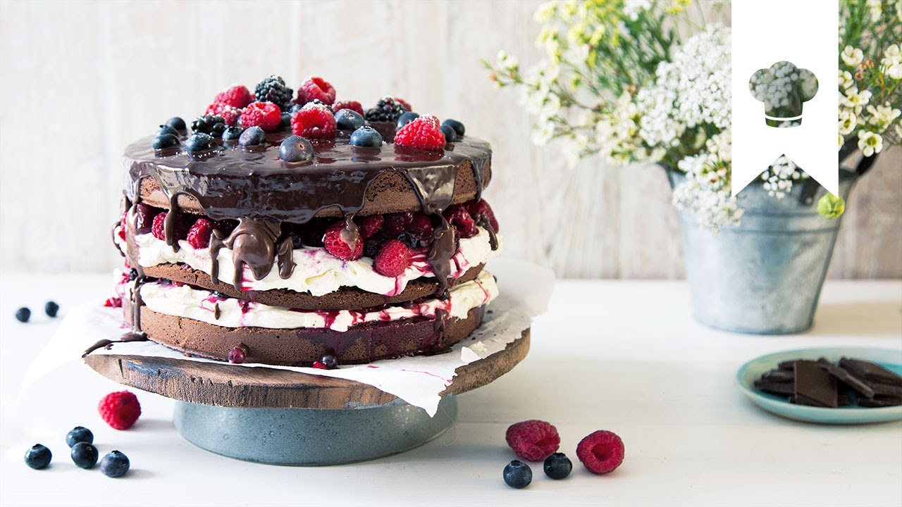 Unser Naked Chocolate Cake wird mit einem dunklen Tortenboden und einer feinen Waldbeerenfüllung aus Mascarpone und Sahne zubereitet. Mit einem Ganache-Topping, das mit frischen Beeren veredelt wird, ist er in nur einer Stunde fertig.