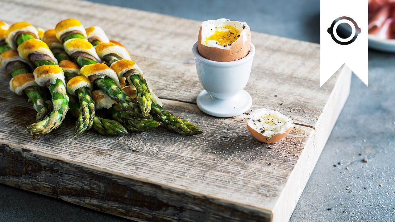 So köstlich Spargel mit Schinken, Kartoffeln und Sauce hollandaise auch schmeckt, irgendwann ist etwas kulinarische Abwechslung gefragt. Vor allem, wenn Sie die kurze Saison für das Stangengemüse richtig auskosten möchten und leichte Gerichte bevorzugen. Unser Spargel-Sticks-Rezept eignet sich besonders gut für das österliche Brunch-Buffet, aber auch kleine Snacks für den gemütlichen Fernsehabend bereiten Sie damit schnell zu. Die Stangen werden dabei nicht wie beim Spargel im Schlafrock komplett mit Blätterteig ummantelt, sondern mit Schinken-Blätterteig-Streifen umwickelt und gebacken. Übrigens: Luftig-lockerer Blätterteig schmeckt nicht nur um Gemüse gewickelt, sondern auch als Basis eines herzhaften vegetarischen Gerichts wie unserer knusprigen Blätterteigpizza – unbedingt probieren! Wie bei allen Spargel-Rezepten kommt es bei der Vorbereitung des Gemüses auf das sorgfältige Schälen an – sonst trüben holzige Stellen den Genuss. Bei grünen Stangen genügt es in der Regel, das Ende abzuschneiden. Schälen müssen Sie allenfalls das untere Drittel. Eine Soße bzw. ein Dip runden das Geschmackserlebnis bei Gerichten mit dem Edelgemüse ab. Bei unserem Spargel-Sticks-Rezept tauchen Sie die Stangen einfach in das weiche Eigelb von 5-Minuten-Eiern ein: zu Ostern perfekt!