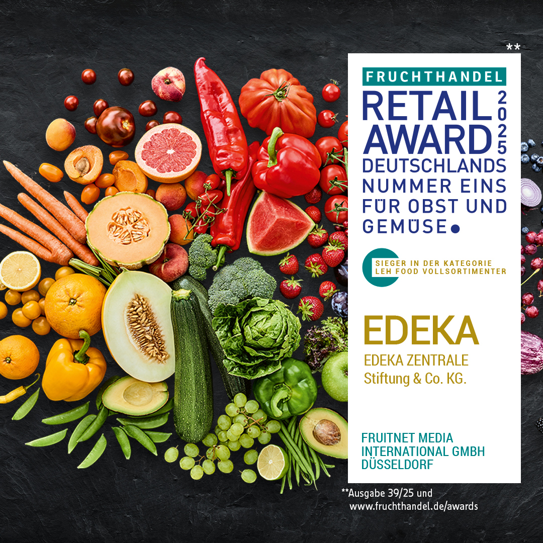 Bereits seit 14 Jahren wird die wichtigste Jury – unsere Kund:innen – durch das Marktforschungsinstitut Customer Panel Services GfK repräsentativ nach der besten Obst- und Gemüseabteilung in Deutschland befragt. In der Kategorie "LEH Food Vollsortiment" konnte auch in diesem Jahr EDEKA erneut den Retail Award, der jährlich vom "Fruchthandel Magazin" verliehen wird, gewinnen.